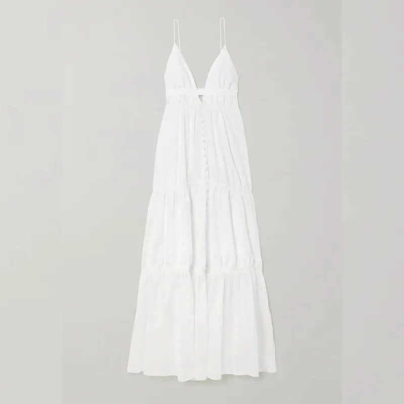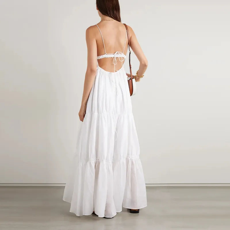సాధారణం లాంగ్ లేయర్డ్ వి నెక్ హాల్టర్ దుస్తుల వివరాలు